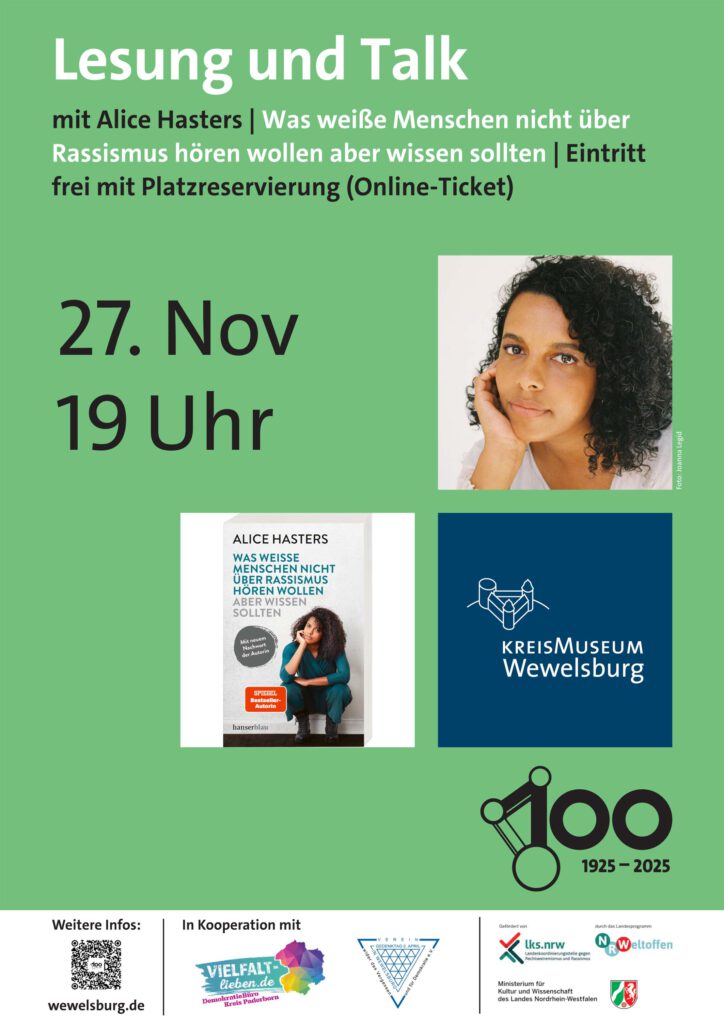 Büren-Wewelsburg. Zu „Lesung und Talk“ mit Alice Hasters lädt das Kreismuseum Wewelsburg am Donnerstag, 27. November, um 19 Uhr im Burgsaal ein. Die Autorin liest aus ihrem Buch „Was weiße Menschen nicht über Rassismus hören wollen, aber wissen sollten“. Der Eintritt ist frei, eine Platzreservierung mit einem Online-Ticket gibt es auf der: Internetseite des Kreismuseums Wewelsburg