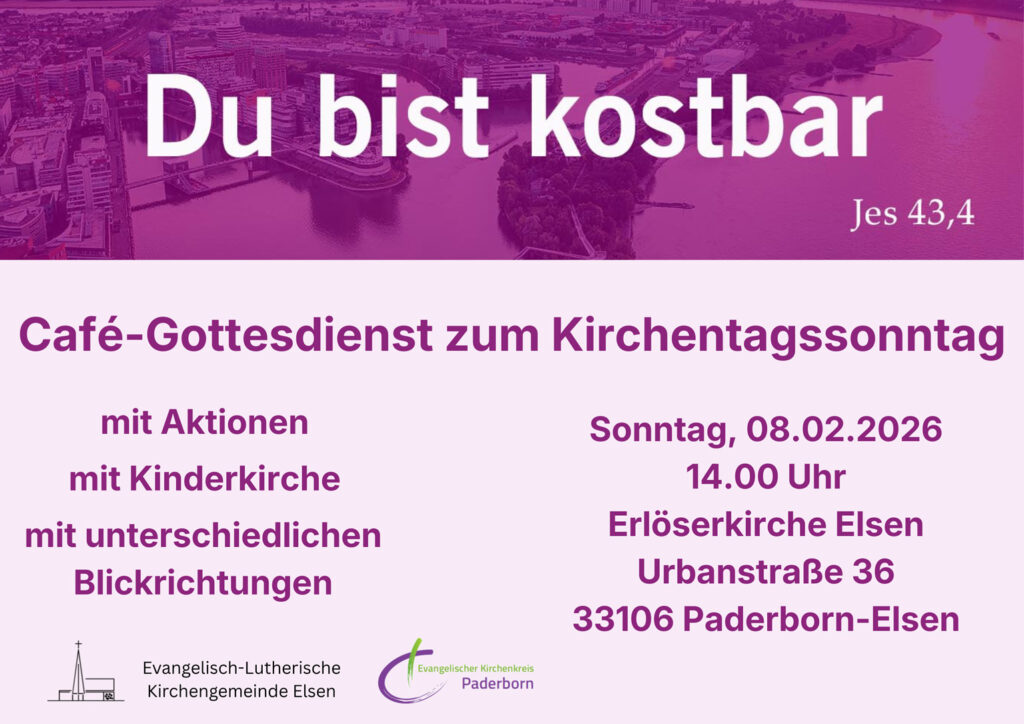 Paderborn-Elsen/Kirchenkreis (ekp). Am Kirchentagssonntag, 8. Februar, wird um 14 Uhr ein Gottesdienst des Evangelischen Kirchenkreises Paderborn in der Erlöserkirche, Urbanstraße 36 in Paderborn-Elsen, gefeiert. Im Zentrum steht das Motto „Du bist kostbar“ (Jesaja 43,4) des 40. Deutschen Evangelischen Kirchentages 2027 in Düsseldorf, auf den dieser Gottesdienst einstimmen möchte.