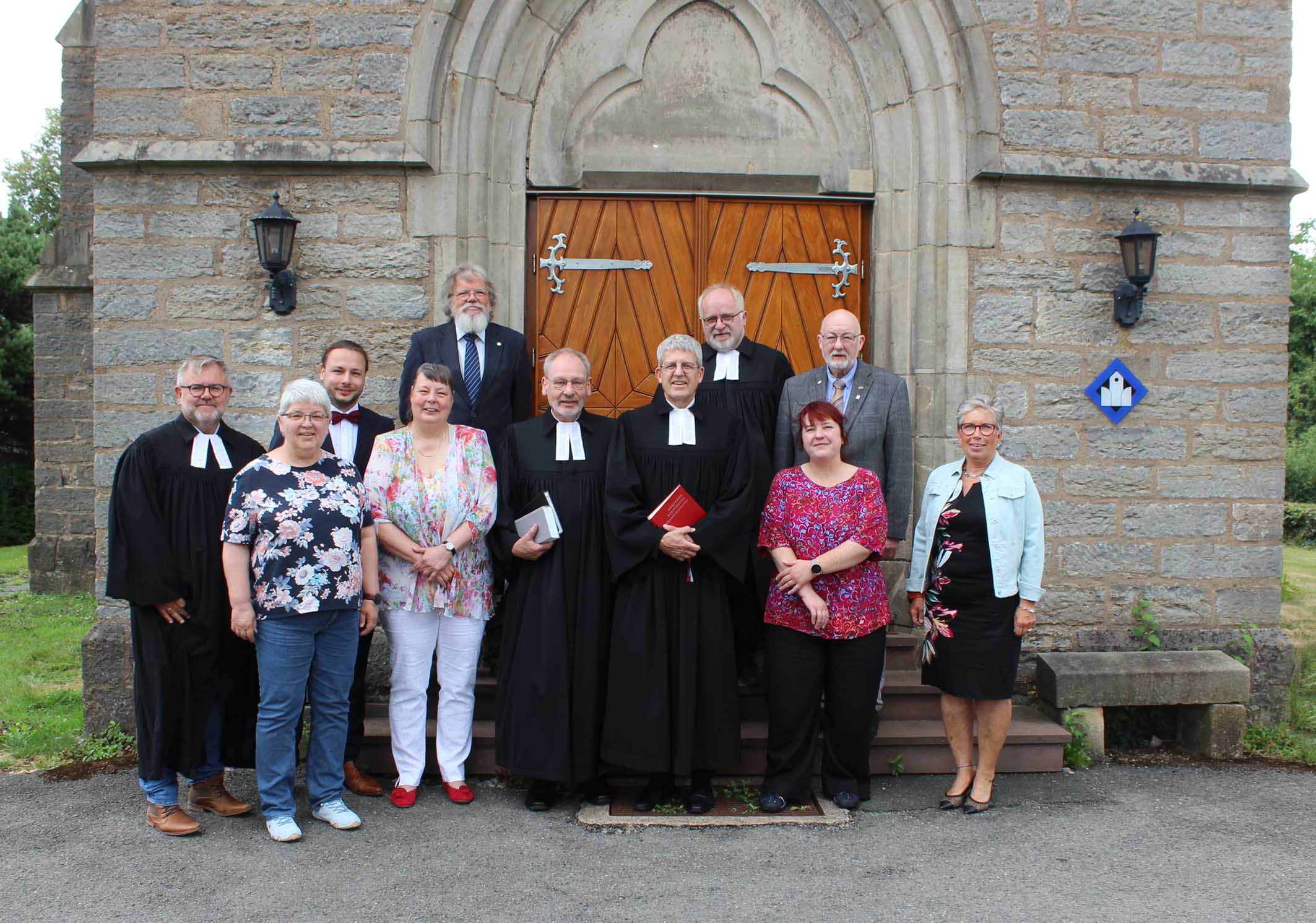 An der Verabschiedung in der Ev. Kreuzkirche in Nieheim waren beteiligt (v. l.): Schulreferent Burkhardt Nolte, Irmgard Alboth (KSV), Tobias Neumann, Christiane Neumann, Jürgen Engelmann (KSV), Schulpfarrer und Scriba Wolfgang Neumann, Superintendent Volker Neuhoff, Pfarrer Volker Walle sowie Rolf Hellweg, Sonja Heine und Evelyne Schubert (alle drei KSV).