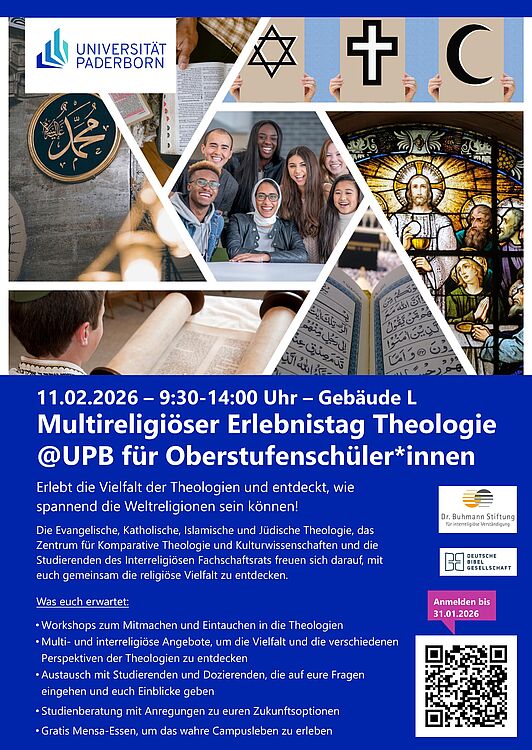 Paderborn. Ein „Erlebnistag Theologie“ findet am Mittwoch, 11. Februar 2026, von 9.30 bis 14 Uhr an der Uni Paderborn statt. Eingeladen sind interessierte Oberstufenschülerinnen und -schüler. Veranstalter sind die Institute für Evangelische, Katholische und Islamische Theologie, das Seminar für Jüdische Studien sowie das Zentrum für Komparative Theologie und Kulturwissenschaften (ZeKK) und der Interreligiöse Fachschaftsrat der Uni Paderborn.