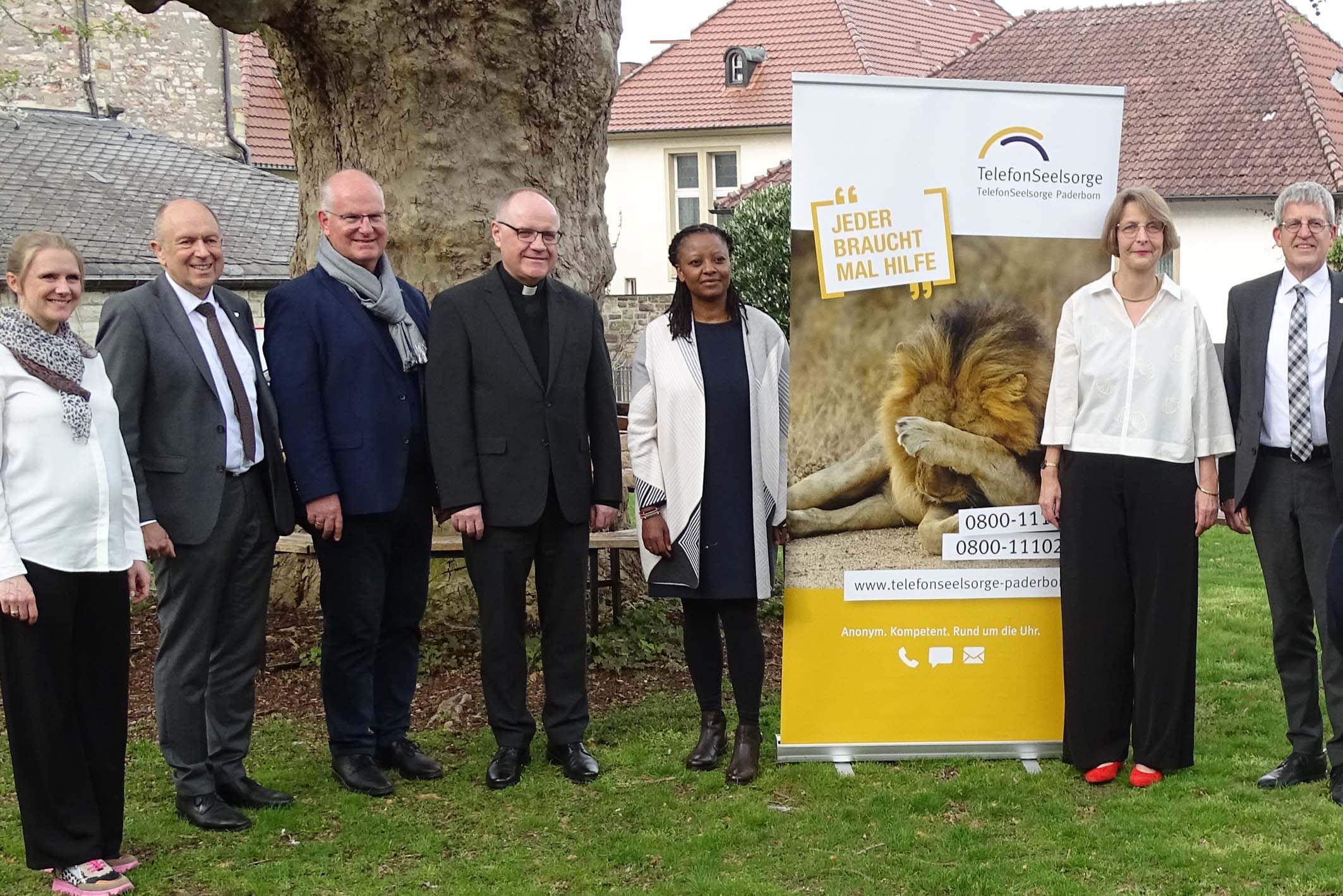 Bei der Jubiläumsfeier (v. l.): Stv Bürgermeisterin der Stadt Paderborn Stefanie Harth, Landrat Christoph Rüther, Geschäftsführer Gemeindeverband Kath. Kirchengemeinden OWL Detlef Müller, Pfarrer Dr. Thomas Witt, Leiterin Telefonseelsorge Paderborn Evelyne Waithira Müller, Stv. Leiterin Telefonseelsorge Paderborn Dorothea Wahle-Beer und Superintendent Evangelischer Kirchenkreis Paderborn Volker Neuhoff.